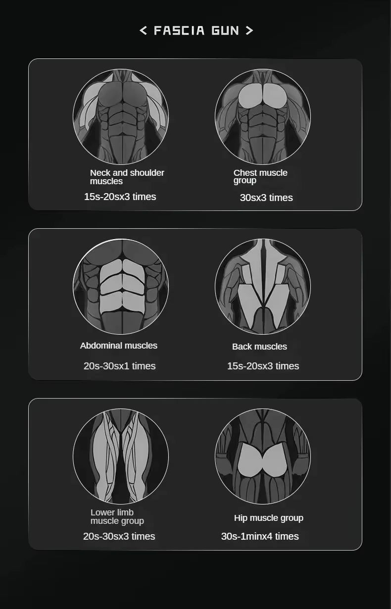 ⏱️ Utilise 30 à 60 secondes par zone pour un massage efficace.